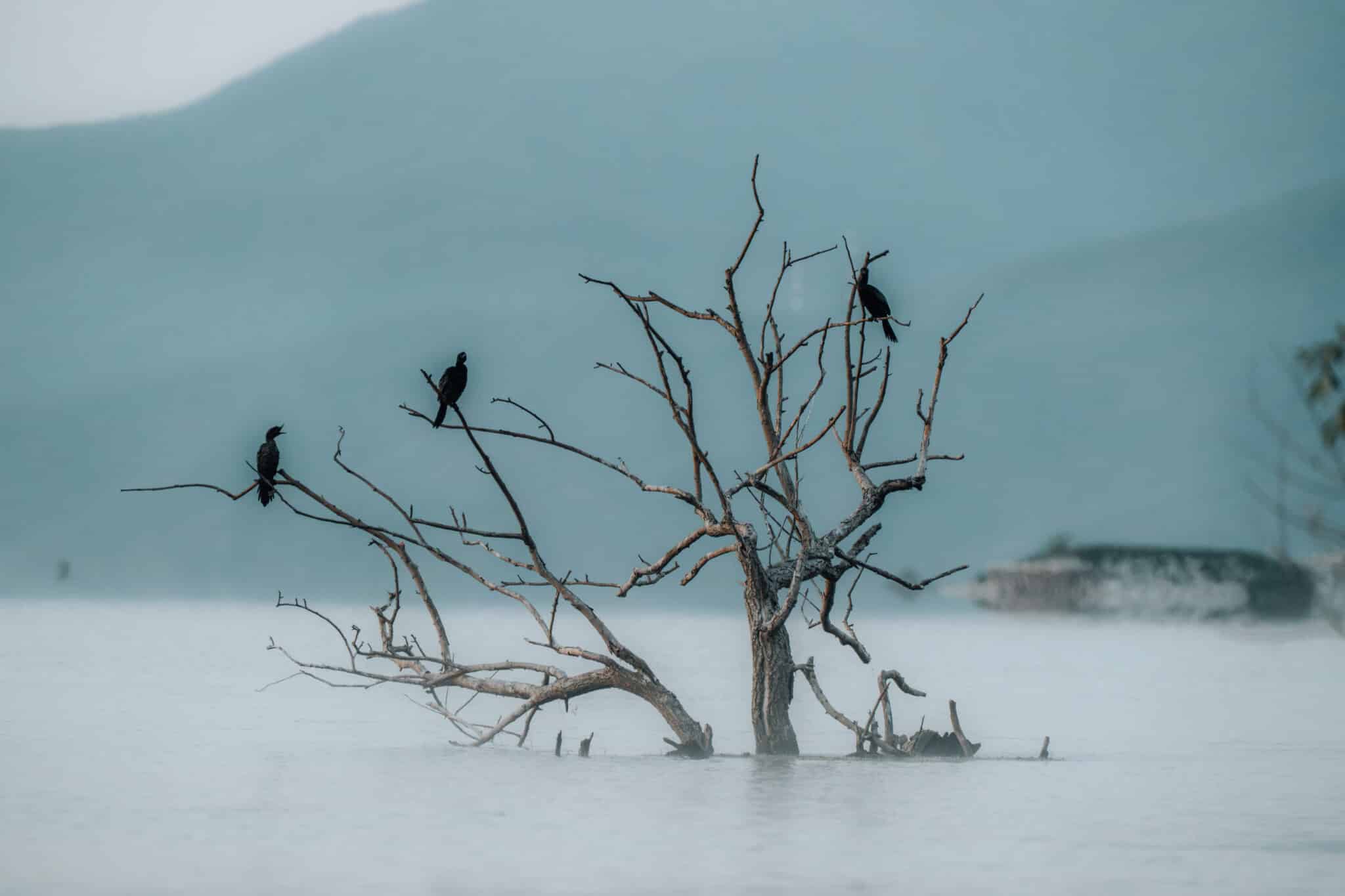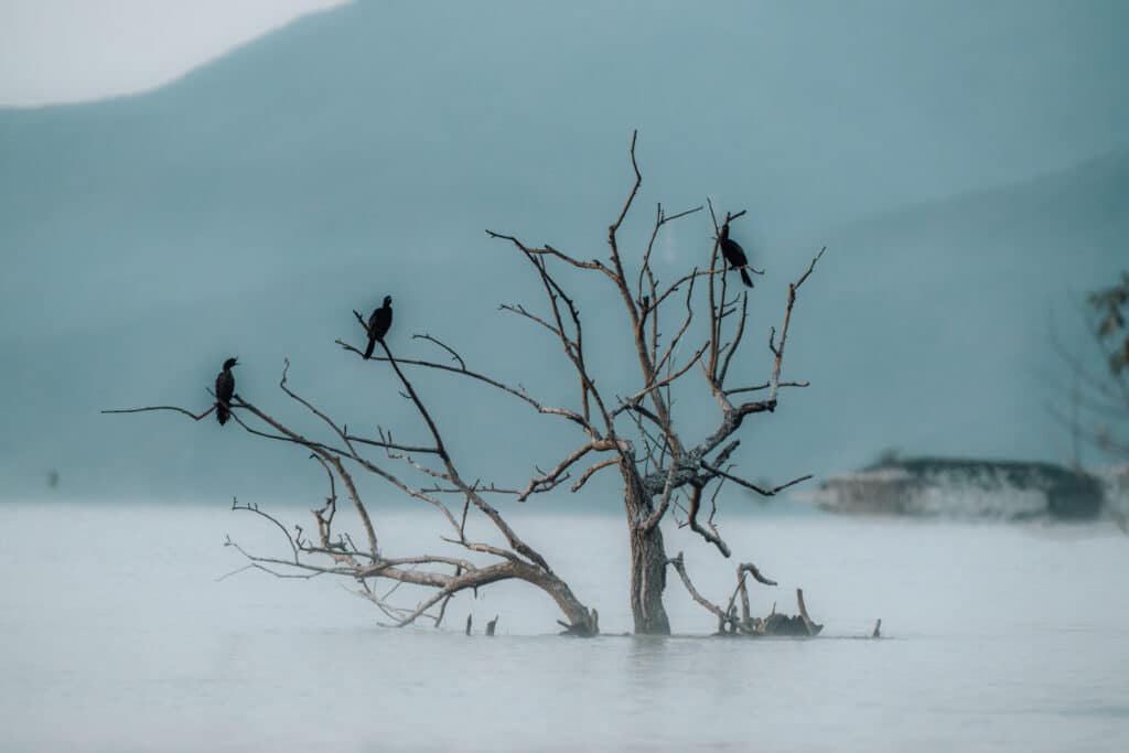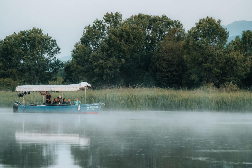 Καθώς η βάρκα μας κυλά αθόρυβα στα νερά, νιώθουμε σχεδόν τους παλμούς της λίμνης. Προσπαθούμε –μάταια– να αποκωδικοποιήσουμε τα κελαηδήματα των πουλιών, ενώ η απαλή ομίχλη μας τυλίγει σε μια μυστικιστική ατμόσφαιρα. Ανάμεσα στους καλαμιώνες, το βλέμμα μας στέκεται στις περίτεχνες, επιπλέουσες φωλιές – μικρές κατοικίες φτιαγμένες με ακρίβεια και φροντίδα, καταφύγια για πλήθος πουλιών. Κοντά στα παιχνιδιάρικα σκουφοβουτηχτάρια, ένα ζευγάρι κύκνων λούζεται στο πρωινό φως, γλιστρώντας πάνω στην επιφάνεια του νερού με λεπτεπίλεπτες κινήσεις. Πιο πέρα στα κλαδιά των βυθισμένων δέντρων της λίμνης, σκοτεινές σιλουέτες κορμοράνων σχηματίζουν μικρές αποικίες. Στέκονται ακίνητοι, με τα φτερά τους ανοιχτά, περιμένοντας υπομονετικά να στεγνώσουν κάτω από τον πρωινό ήλιο.