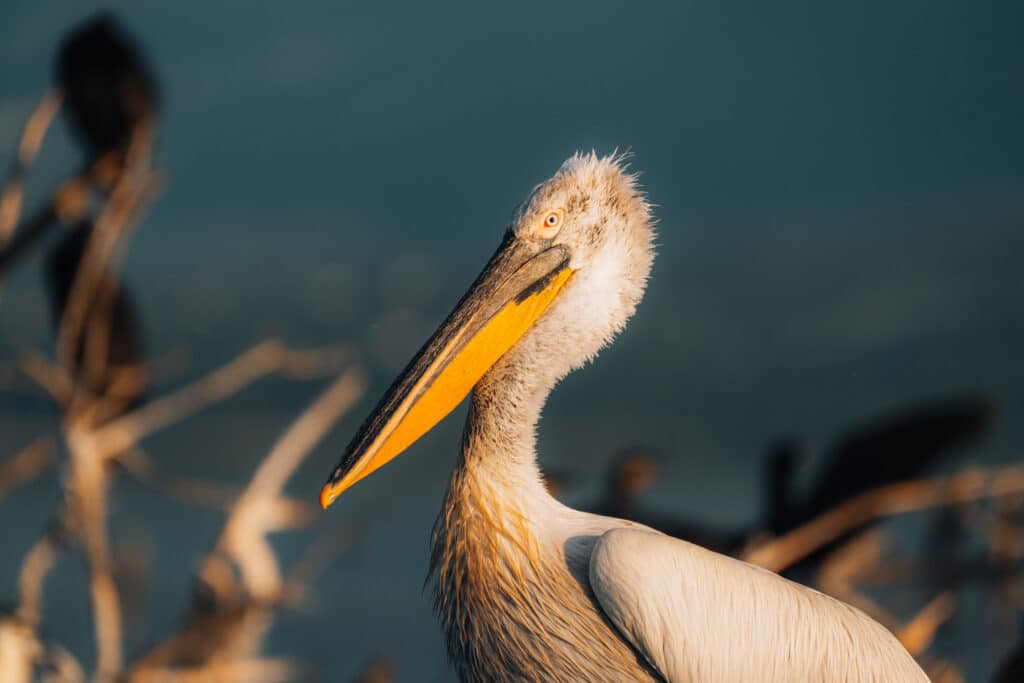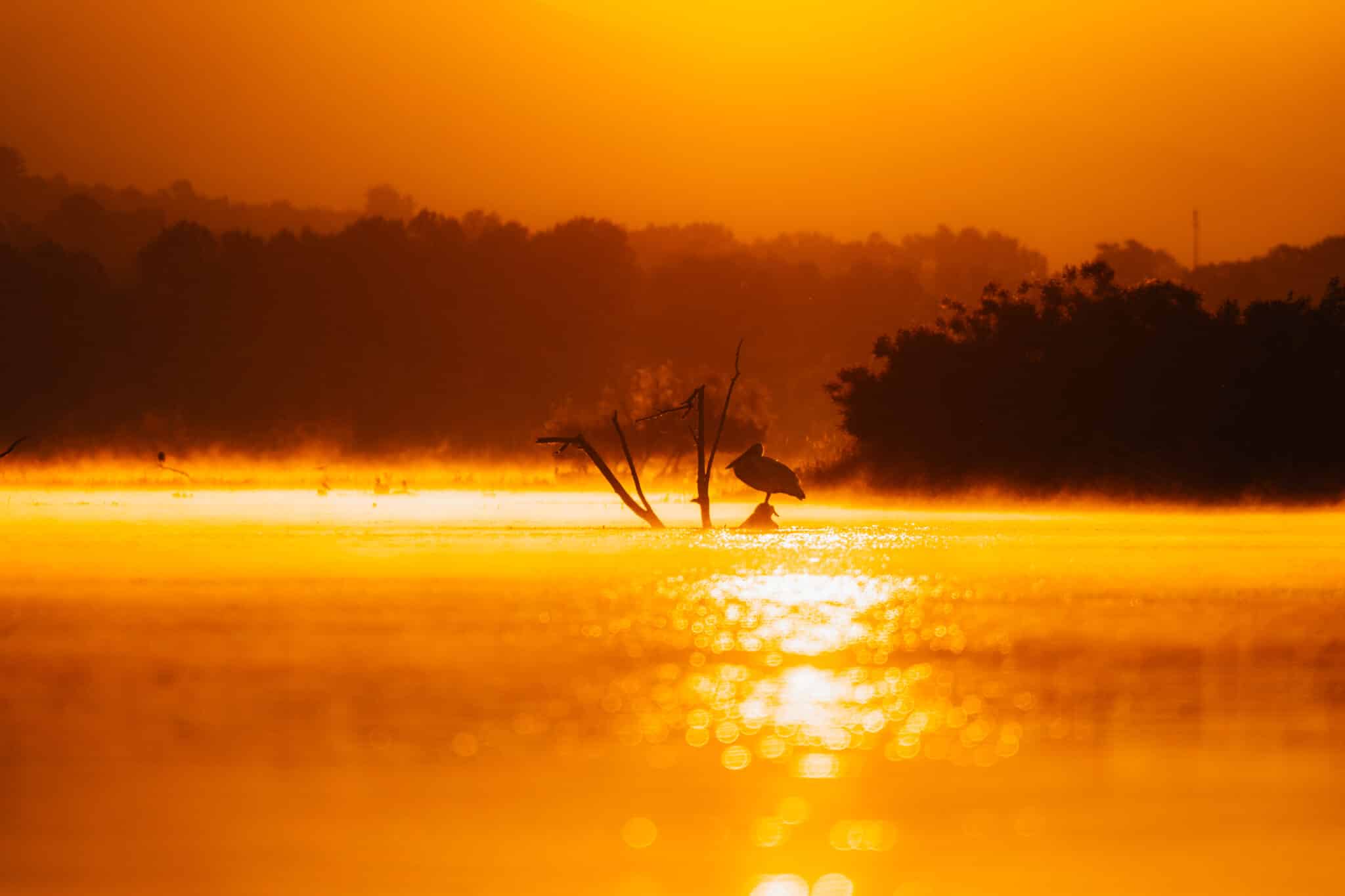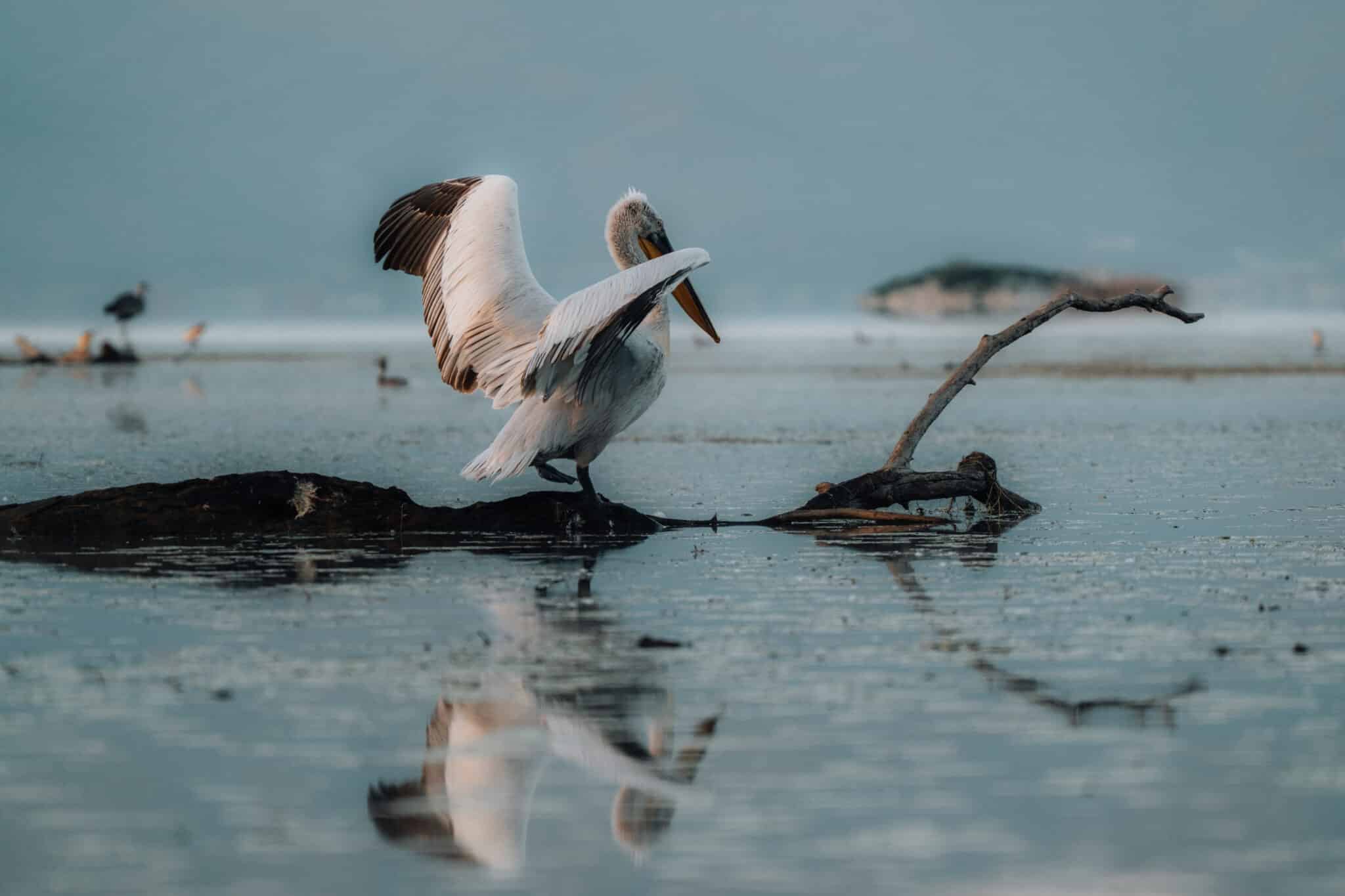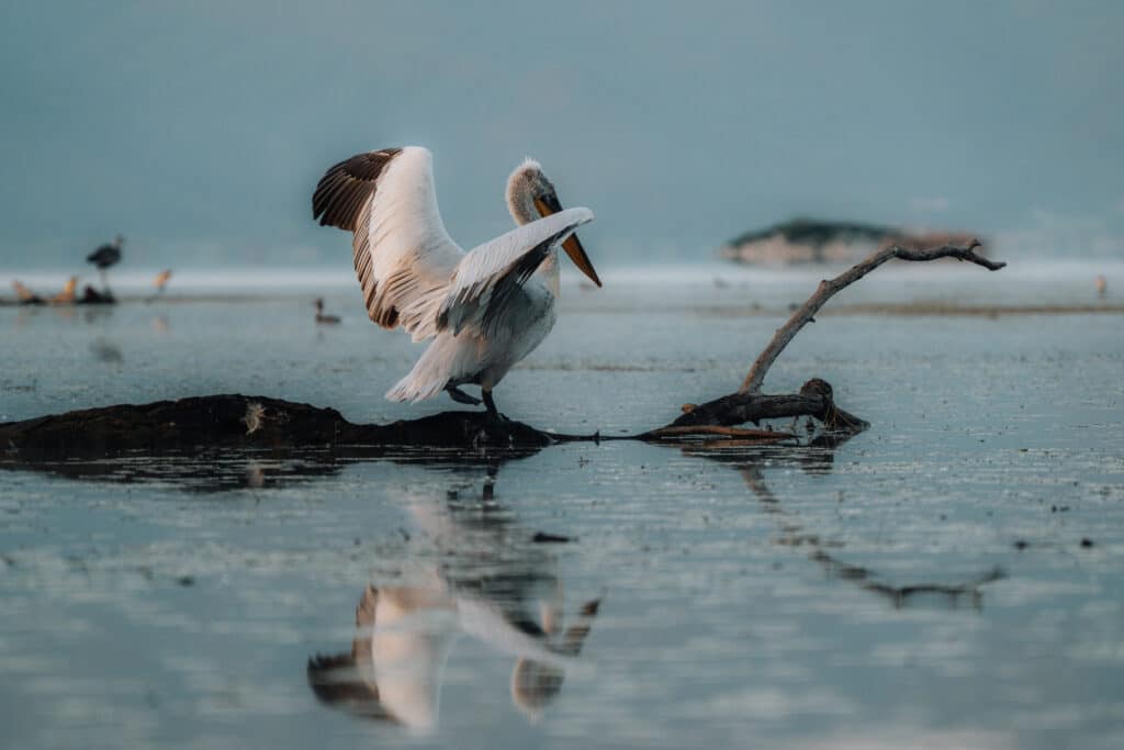 Στις όχθες και μέσα στο παραποτάμιο δάσος, ερωδιοί με περήφανη κορμοστασιά και μακρόστενα ράμφη ξεχωρίζουν. Το φτέρωμά τους ποικίλει: γκρίζο, λευκό έως πορφυρό και καφέ – χρώματα που μπλέκονται με την παλέτα της φύσης. Ψηλά στις φωλιές των δέντρων νεογνά χουρνιάζουν ανυπόμονα, περιμένοντας τροφή από τους γονείς τους. Στο βάθος ξεχωρίζουν τέσσερα φλαμίνγκο, δεν έχουν εγκαταλείψει ακόμη τη λίμνη – το ροζ τους αντανακλά στο νερό. Δεν μπορώ να μην ρωτήσω για τις βίδρες. Ο κύριος Μιχάλης μου λέει κοιτάζοντάς με: «Παλιά κρέμονταν στα δέντρα σαν τσαμπιά…Τώρα είναι δύσκολο να τις δεις. Θέλουν πολύ καθαρά νερά. Και οι μυοκάστορες τις έχουν απωθήσει». Πιο πέρα αργυροπελεκάνοι με τον μεγάλο σάκο κάτω από το ράμφος ξεκουράζονται στα βυθισμένα παρατηρητήρια και εντυπωσιάζουν με το άνοιγμα των φτερών τους. Τώρα πια οι χρυσές ακτίνες του ήλιου έχουν διαλύσει την ομίχλη, και εμείς βρισκόμαστε σε μια απόλυτη σύνδεση με τη Φύση.